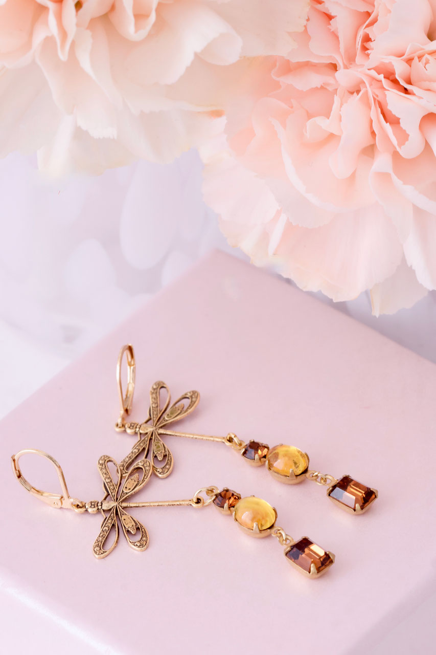 Material: Ohrhänger aus vergoldetem Edelstahl, Libellen aus altvergoldetem Messing, vintage Swarovskisteine (braun) und vintage Glassteine aus der BRD (ockergelb) in vintage Fassungen. Die Libellen werden aus vintage Modeln aus den 60er/70er Jahren gestanzt.