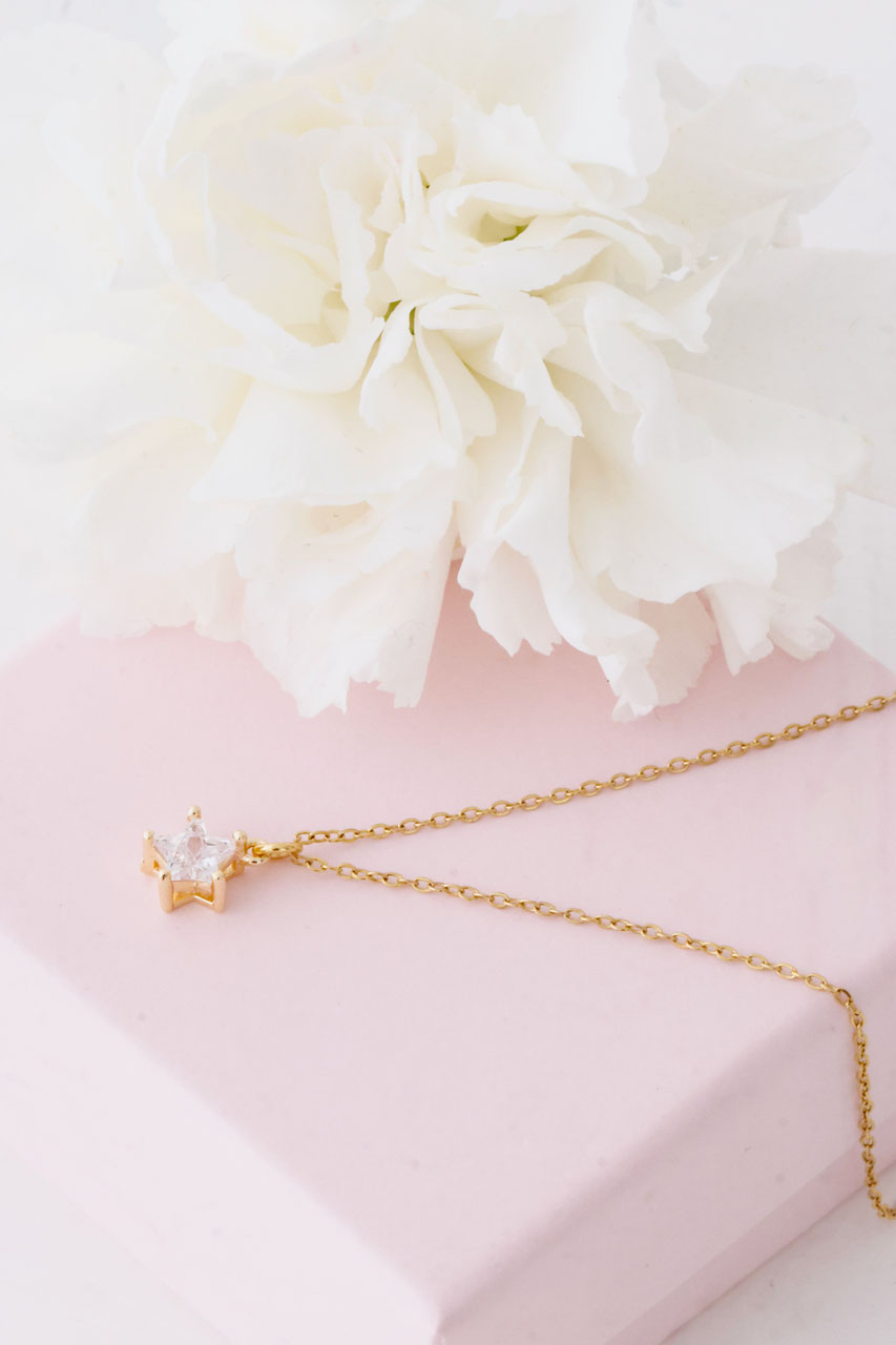 Material: Ohrstecker und Kettchen aus echt vergoldetem Edelstahl,Anhänger aus echt vergoldetem Messing mit Zirkonia-Steinen.